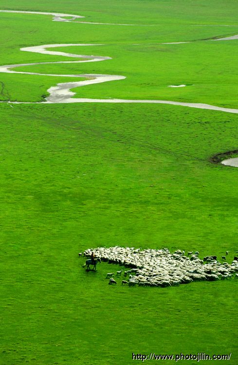 能感受到清风拂过耳畔...... 复杂的曲水 简单的羊群 在碧绿的大草原上 这些都变得那么轻松从容 碧草蓝天 从容淡定 喧嚣在外 宁静在心:)