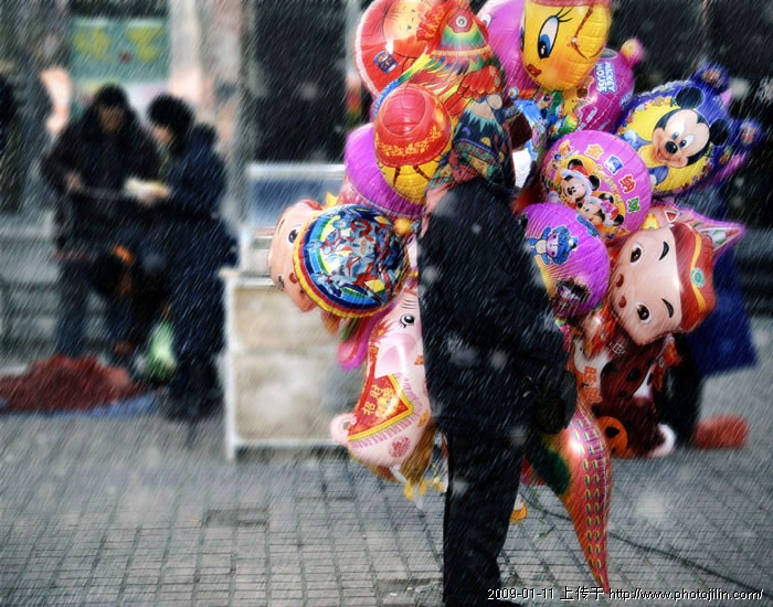 对这位风雪街头中卖气球的老人
