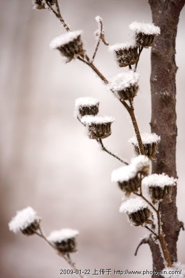 细微见真情。作者把镜头对向了于无声处的蒿草,落雪覆盖在干枯的果实上面,显示出季节的特色,也告示了一年的轮回,一个春天的即将开始。果实顽强的熬冬,就是为了守候春天的到来。春天是什么,春天是一切的希望。