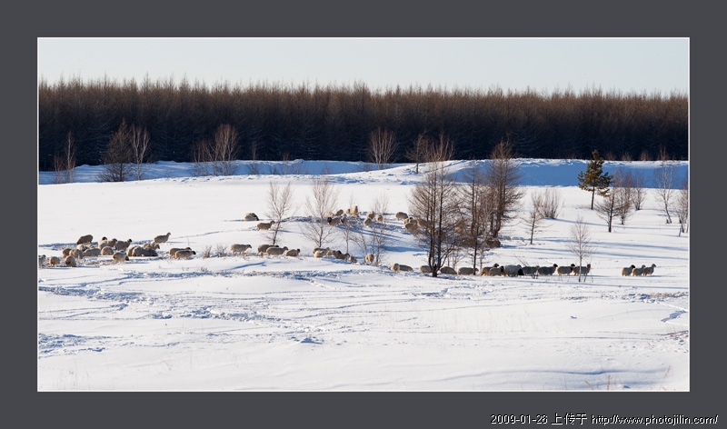看来数码片片,在表现雪的色彩和质感上比起反转片就差一些了。但是在这幅画面里,作者扬长避短,用羊群凸现了雪地使整个屏蔽了生命的地方活跃起来。给人以严酷之中的温馨气氛。