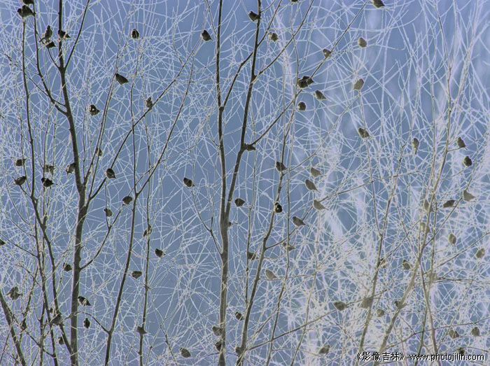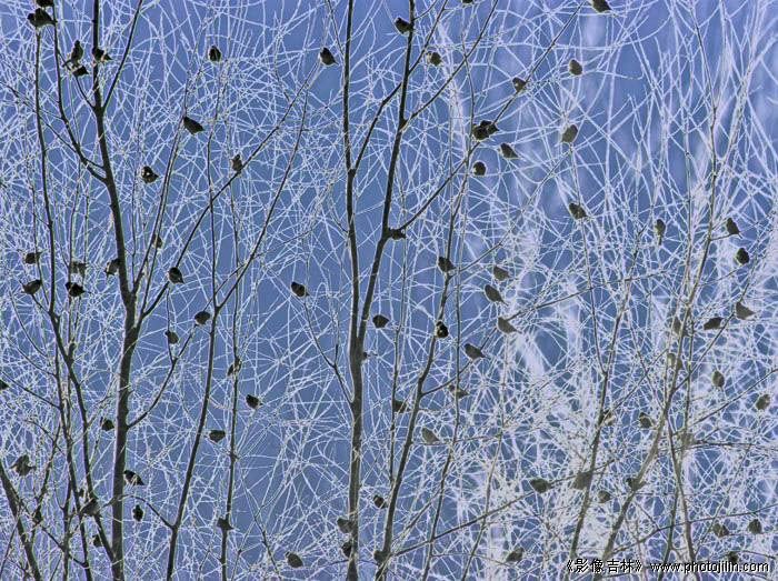 确实美,小鸟分布和点缀的很好,与后面的白色霜枝相映,雅致和谐。赞赏!