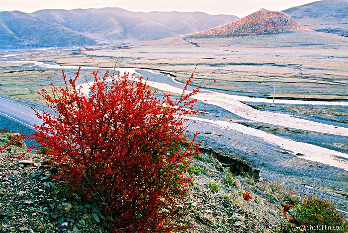 五彩经幡山与火红的秋叶遥想呼应