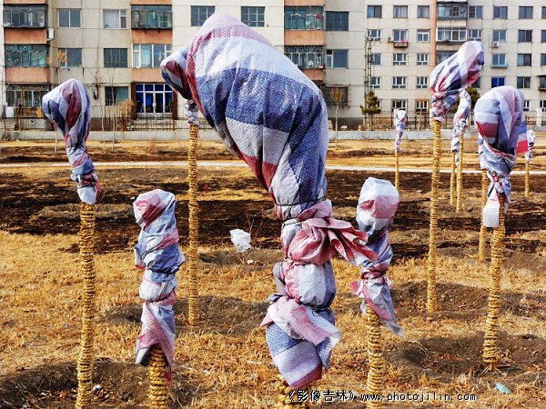 几十棵小树被园林绿化工作人员修剪了枝叶子,戴上了帽子,穿上了棉衣。