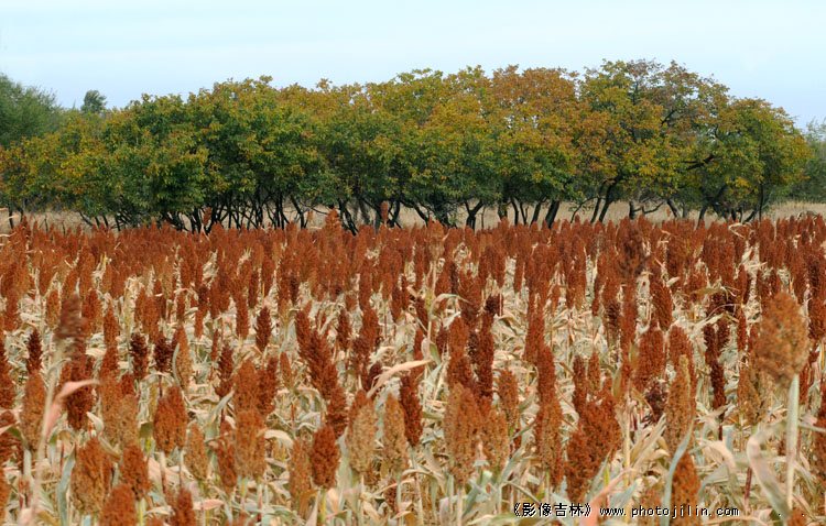 远处整齐的黄榆与这片红高梁