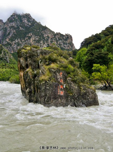 尼洋河有一处景观叫中流砥柱,那块岩石像一牧带纽的四方印章,有一幢别墅大小,矗立在尼洋河激流中心。河水冲击到这块巨石上,溅起一片浪花,翻滚激荡,夺路而去。中流砥柱位于川藏路上的尼洋河中游,山高沟深,河流湍急,为尼洋河第一大峡谷,自此进入了川藏高原的漫漫险路。