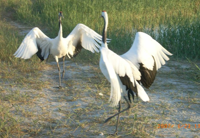 鹤翩翩起舞,真有如跳芭蕾的姿态。抓的好。