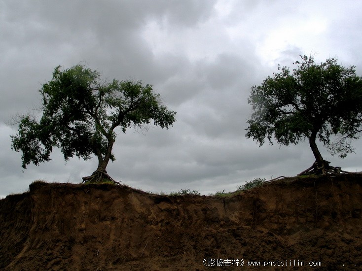 阴雨朦朦,乌云笼罩,整个环境低沉、悲凉,两颗古榆面临绝境,画面凝重,震撼人心。题材好,有内涵,有感染力。
