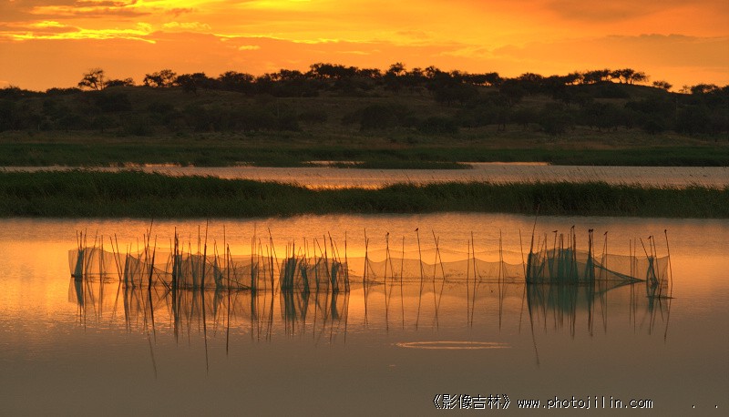 夕阳落日,余晖下的湖面如同金子一般,静静的山林,静静的渔网,唯有鱼儿跳跃后的波影涟漪打破了画面的宁静。作品情景交融,有动有静,如诗如画,含蓄隐约的灵气给作品增添了一种神秘与活气,展示出作品的一种高雅艺术风格。