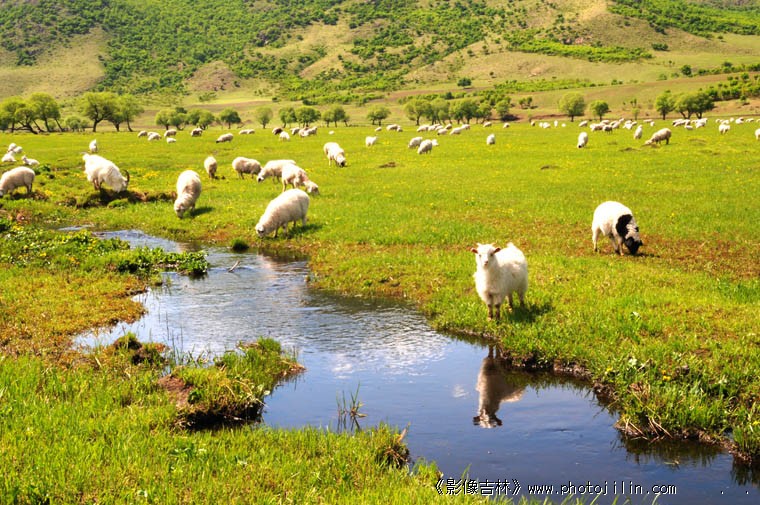 羊群,草原,小溪,山坡。一幅美图。