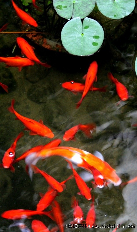 浮萍如镜,红鲤似梭。水清见底,鱼戏扬波。画面生动,色彩亮丽,好图,欣赏。