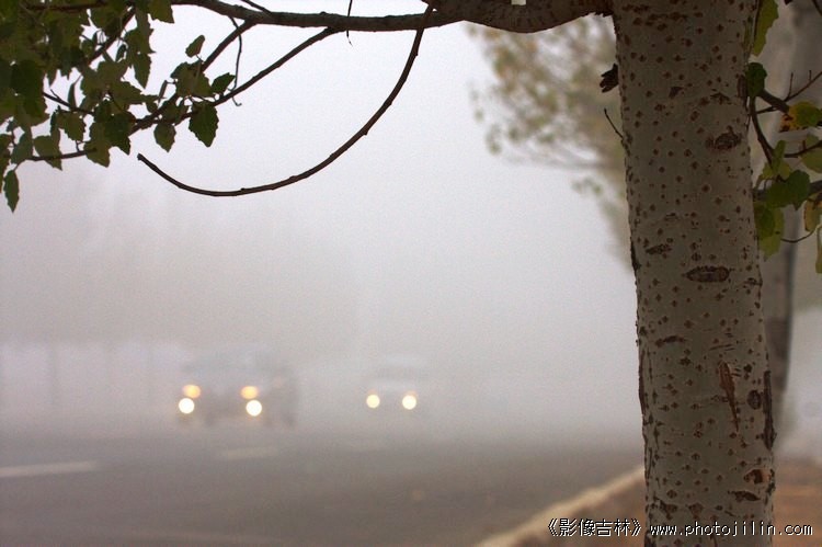 漂亮的雾中行拍摄。“大雾弥漫、并不明亮的前灯和微弱的车辆轮廓说明雾的浓见度很低,迫使车辆行使小心翼翼”前景的构筑是画面更加完整的关键。