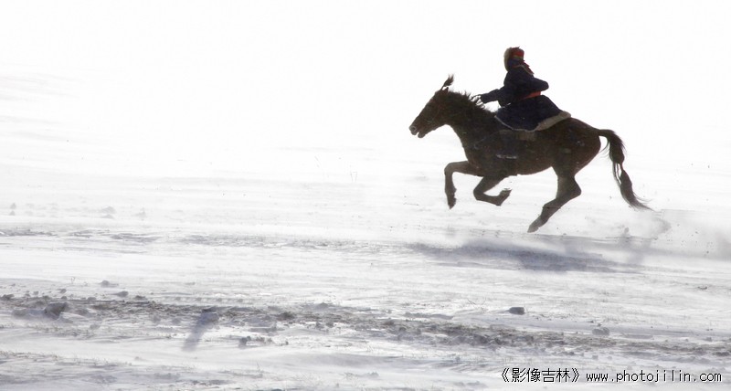 白雪皑皑,骏马奔腾,色彩反差、对比醒目。欣赏。