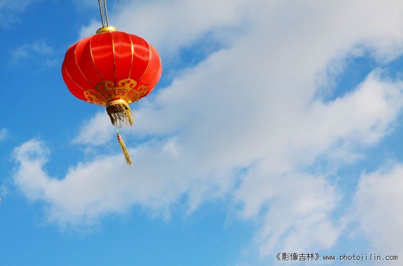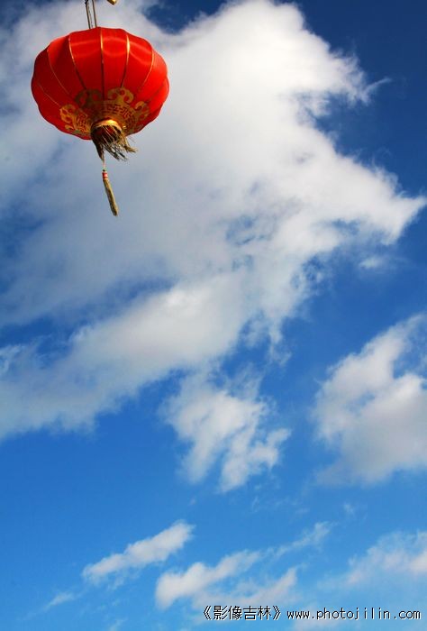 大红灯笼高高挂——蓝天白云下红红的灯笼特别醒目。好片。