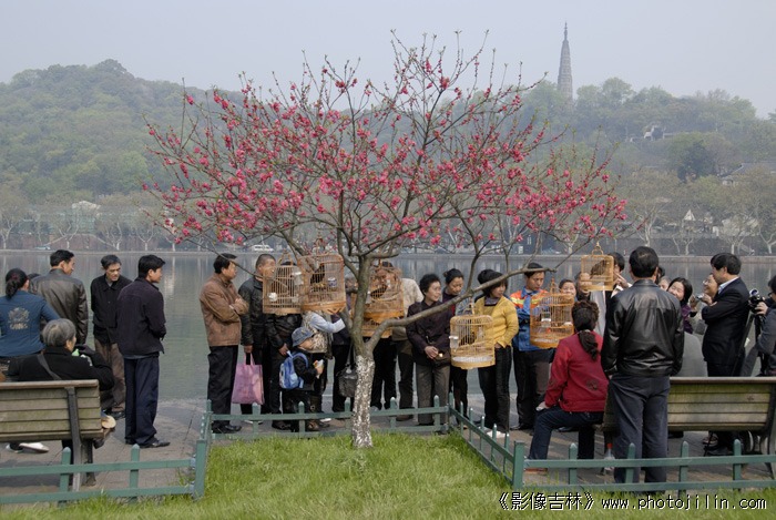 杭州人闲暇之时常到西湖看鸟,三、五成群围着鸟笼斗着八哥背唐诗,好不惬意。