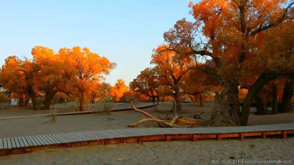 10月12日我没让宾馆叫醒,也没用手机定时,凌晨3点钟我就再也睡不下了。心里就像长了草一样,坐臥不宁。也许是昨日的震撼,也许是对今天美丽所期盼。到了6点30分,我再也按捺不住了,独自走出宾馆,天虽然有些亮意,可离太阳出来还得有一段时间,因而只能悻悻地回到房间里等待。还是朋友心里有数,7点钟他开车准时来宾馆接我们。胡杨林保护区公园距额济纳市区很近,约二十分钟的车程,走进头道桥太阳刚刚从戈壁滩的天际升起,天空仿佛净水洗过一样,宝石般的晶莹,海水般的湛蓝。太阳腾起的刹那间,胡杨林上空一片金光灿灿,真的是让人兴奋,更令人沉醉!