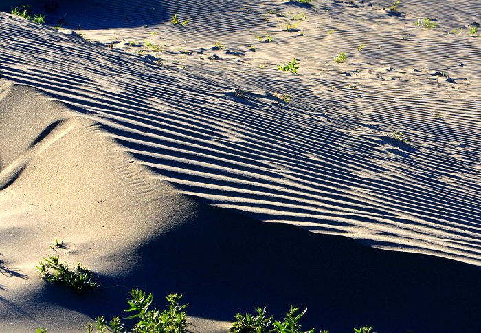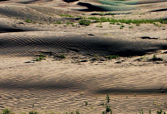 是哪里的沙漠,画面里的条纹非常漂亮,沙漠中曾现出点点绿使画面有的生机。向您学习啦,