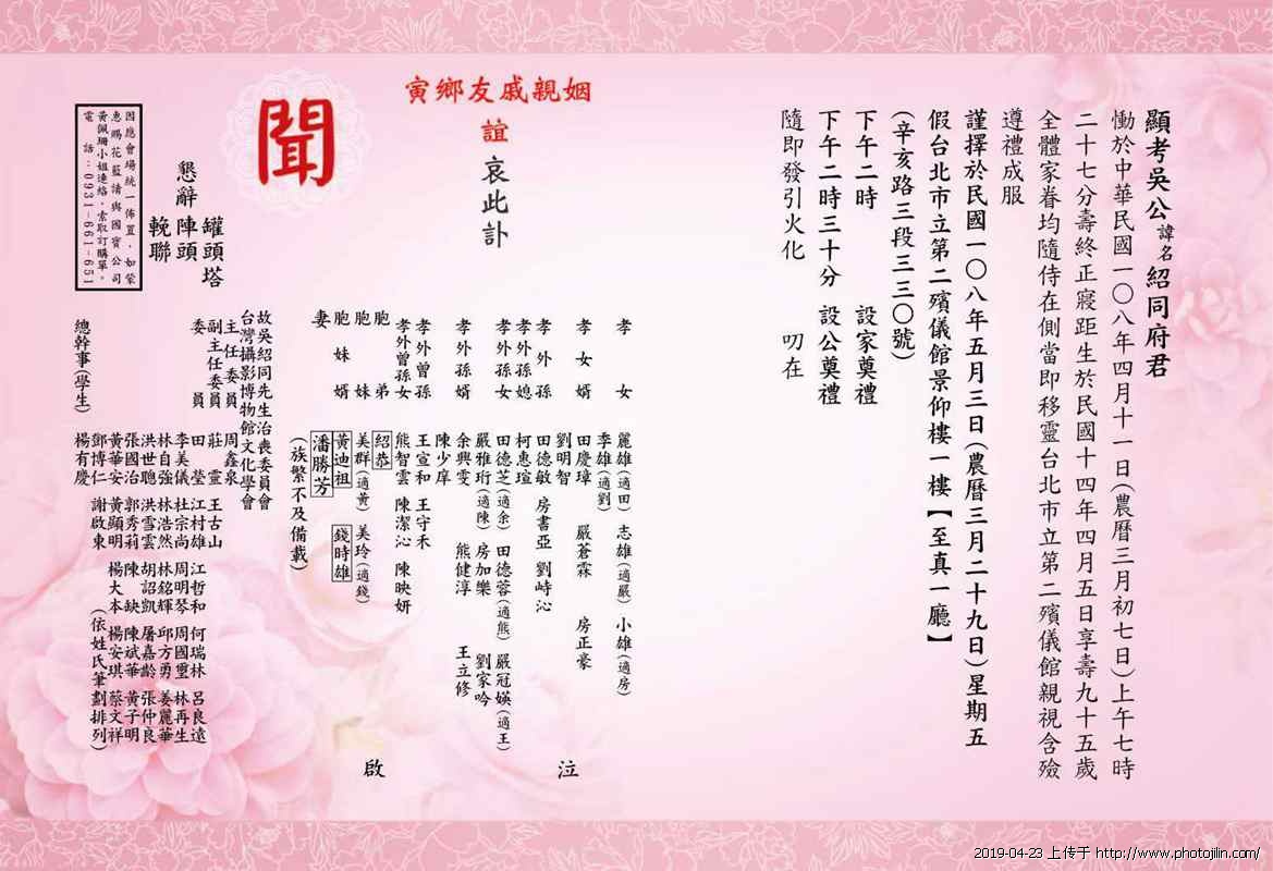 晚年著迷拍鶴、有「鶴人」之稱的攝影家吳紹同,11日因腸疾引發敗血症辭世,享壽95歲。他早年受新聞教育,以影片、相片記錄台灣重大事件,曾經是第一位登上太平島的攝影記者,也曾經在八二三炮戰中赴金門第一線,拍攝戰爭影像。退休後,他的鏡頭轉向創作,跑遍全世界拍攝15種鶴的棲地。好友、攝影師楊永智表示,「他是個停不下來的人。」