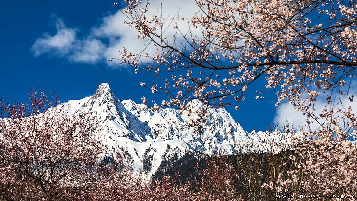 蓝天桃花雪山美极了