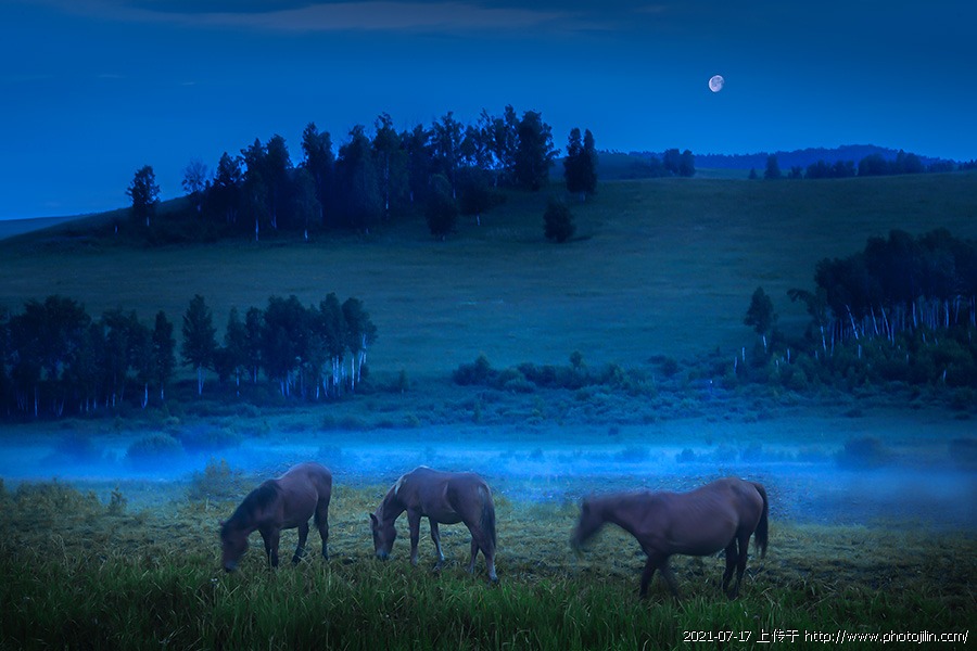 夜色笼罩,马儿悠闲,薄雾飘荡,月光轻柔,好东西都居中,太美了。