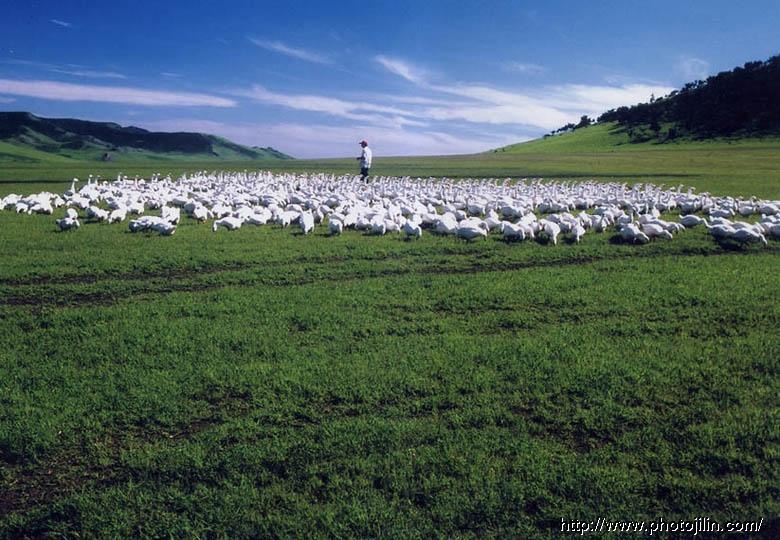 广角构图美,突出了白色的家禽及赖以生存绿色大地!