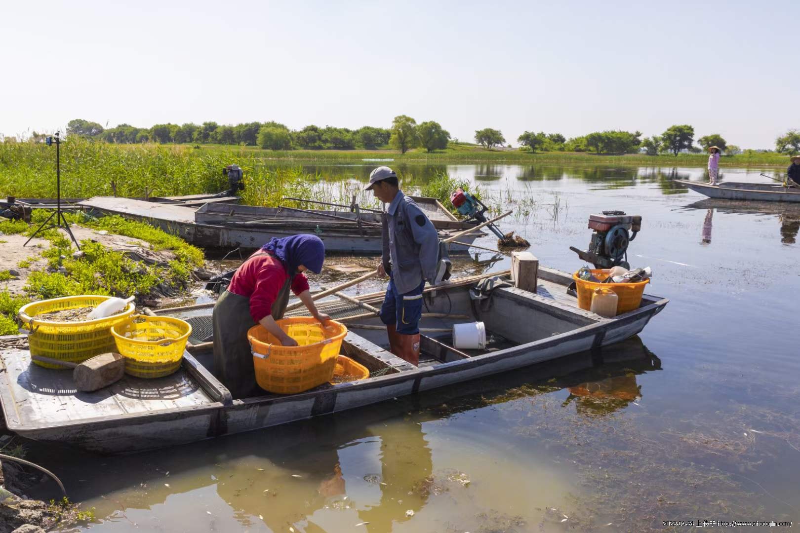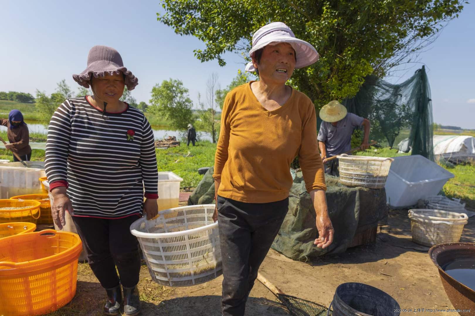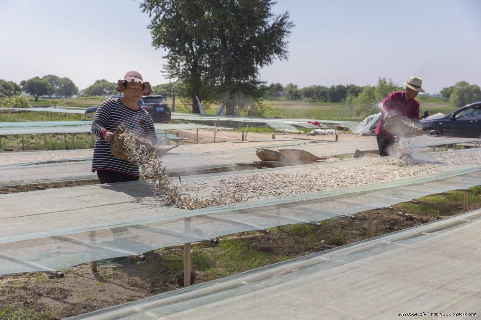 她说:2022年6月18日我们一行5人来到了向海渔场,这里渔民正忙的热火朝天。打捞、上称、清洗、 煮、晾晒等工序。沸腾大锅里煮满了鲜虾 ,工人们捞出晒在架子上。这是我用镜头记录的场面……