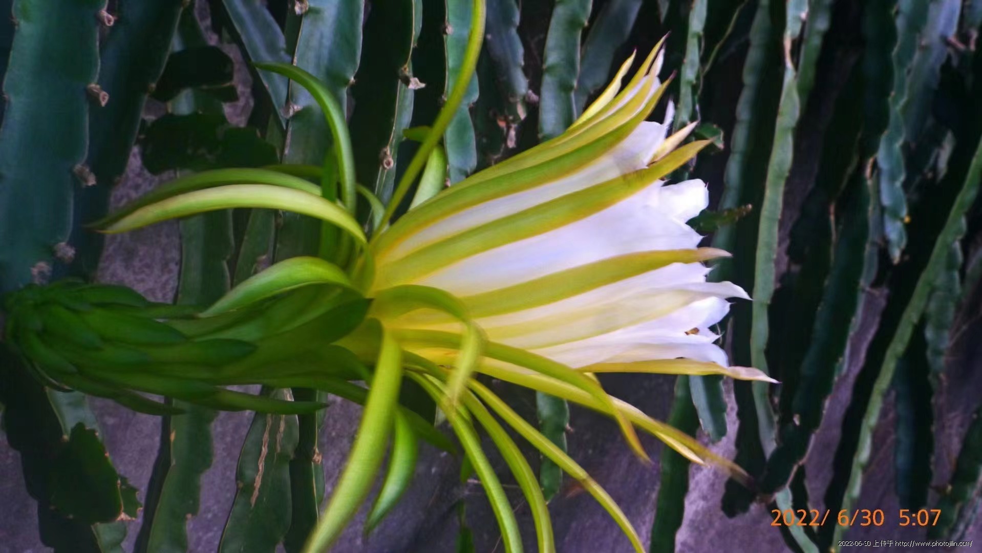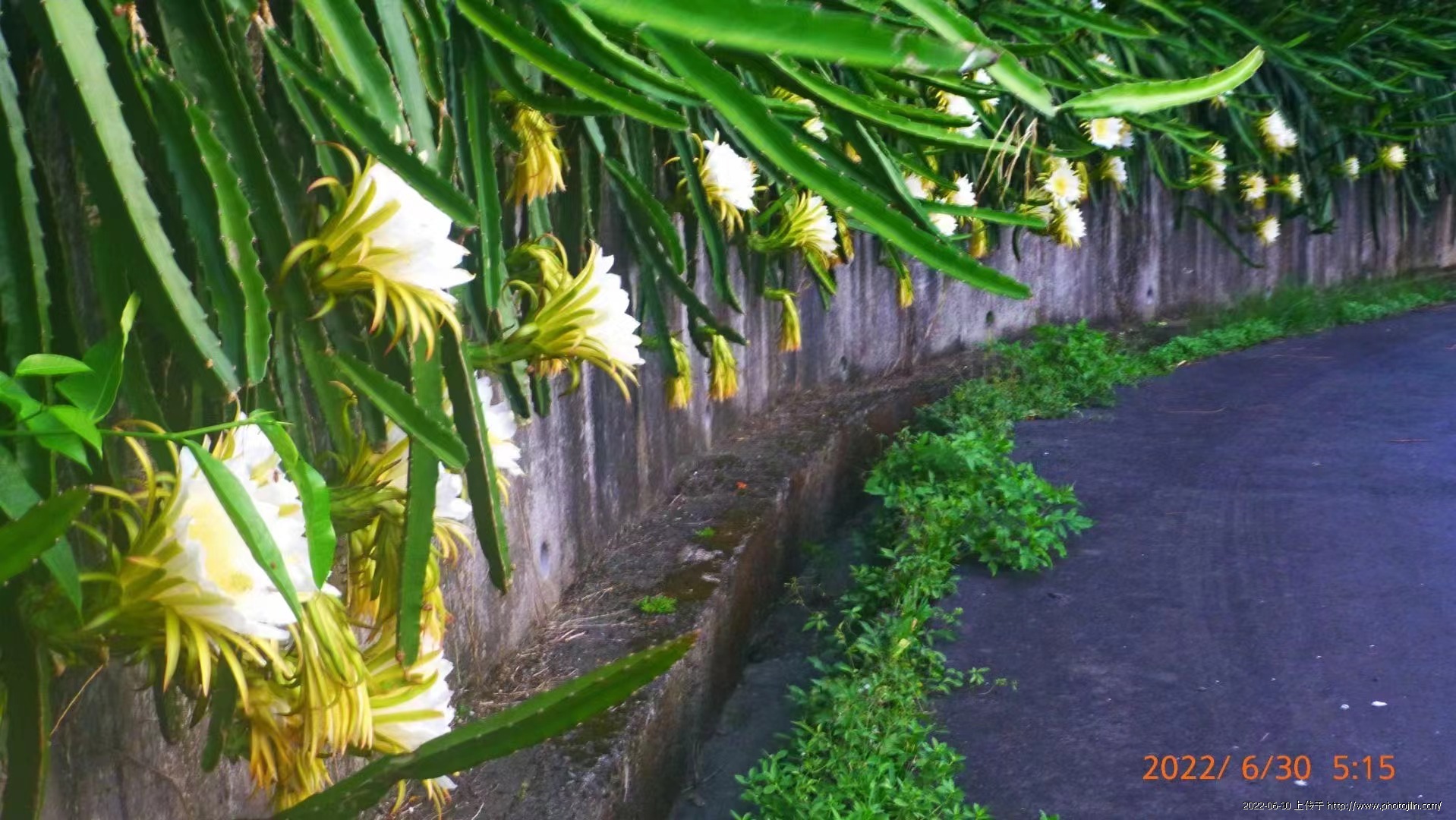 朋友們早上好!社區步道牆上火龍果種植面積達八十米長,形成了獨具特色的觀光步道,火龍果能在清晨時绽放花顏,歡享沁人香濃,真是驚喜不已,(斜出一朵曳仙姿,戀戀人間留芳華)。