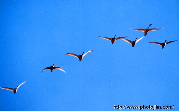 迁徙中,白天鹅的父母大多是一前一后地照顾着它们的孩子.此片是照片扫描,效果欠佳.