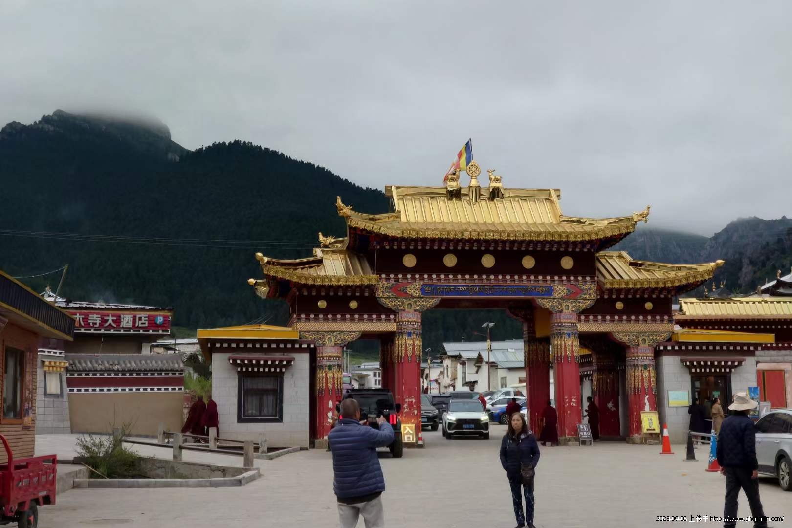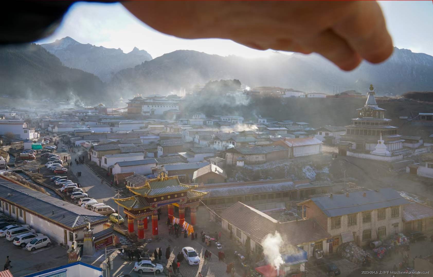 2017年2月,我和影友关伟明、张键、曹庆一行四人,从兰州包车到郎木寺参加晒佛节。正月十五的早晨我在郎木寺附近选择一个建设中的大楼,因冬季停工,我们就从大门下边悄悄的钻了进去,从一楼一直爬到8楼,气喘吁吁的急忙拍几张。今年8月,我带影友再次来到这里,走进旺嘉酒店直奔梯,来到8楼餐厅后,心情百感交集,一晃七年,这里街道、餐饮等变化太大了,心中有一种怀旧感。