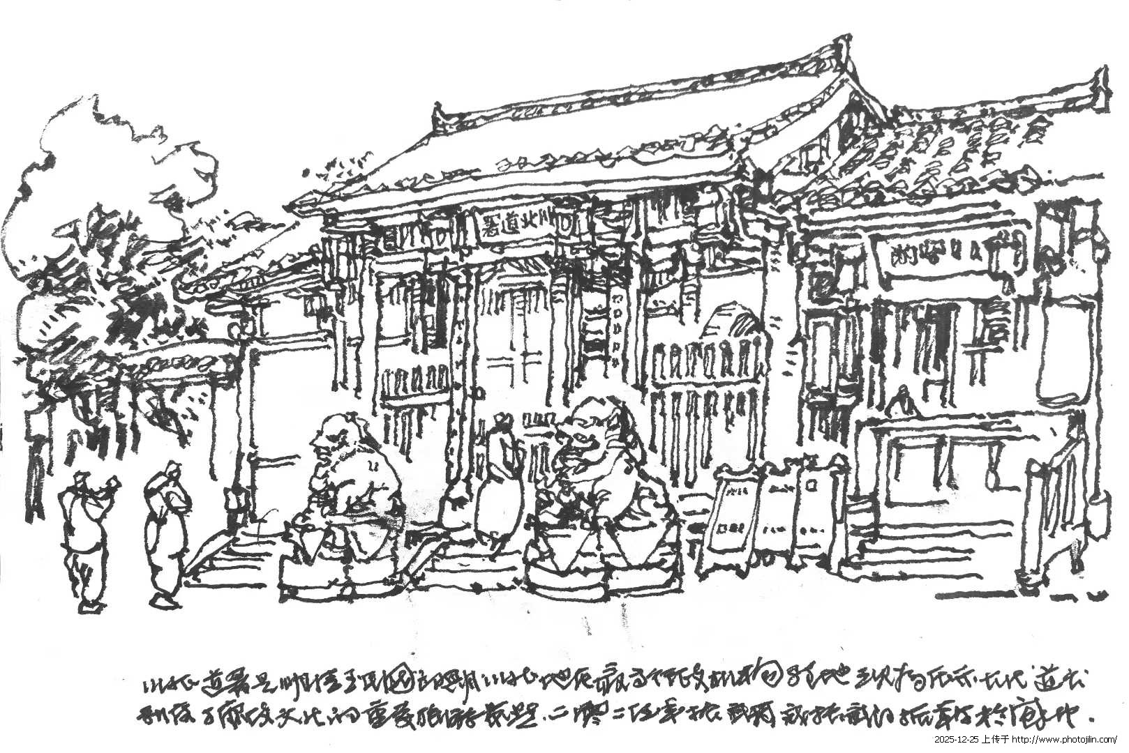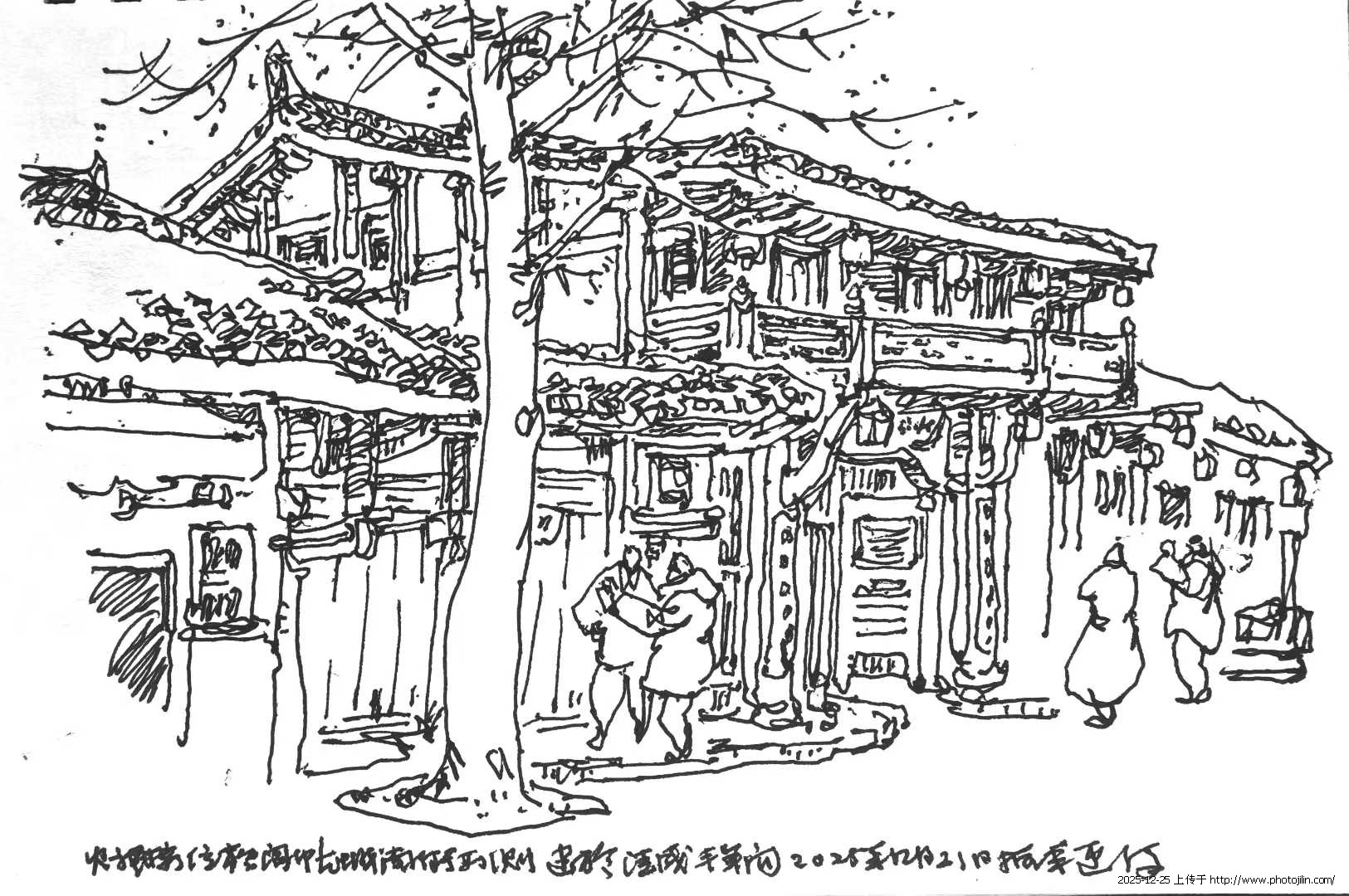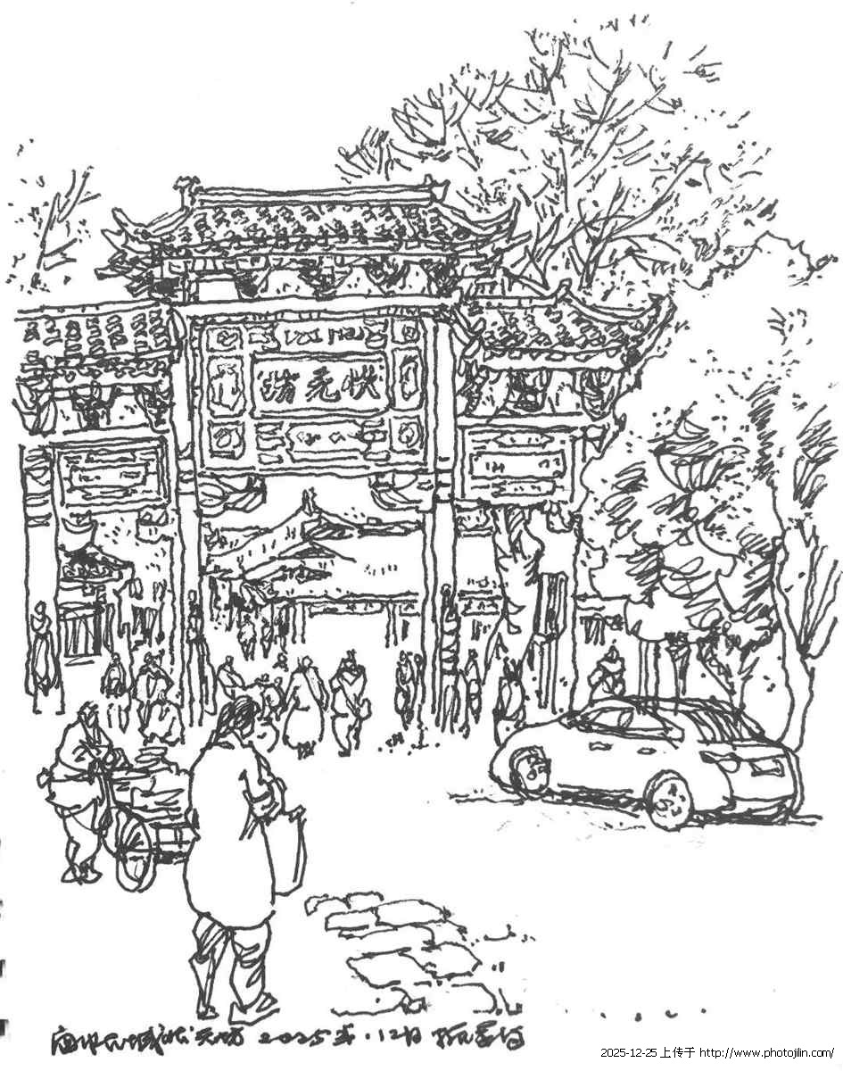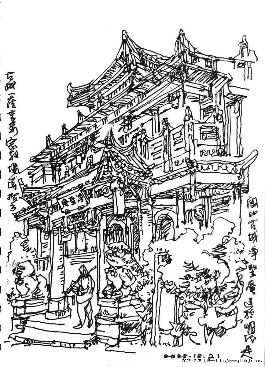 第一笔总落在屋顶上,顿挫的钢笔勾勒出起伏的曲线,再自上而下的书写出每一块建筑构成,千百年的古老建筑在我的画面中逐步清晰可见。我画张飞庙的飞檐,同时加入游人进出拍照的场景,画面因此有了活的纵深——历史与当下在同一页画面上呈现。