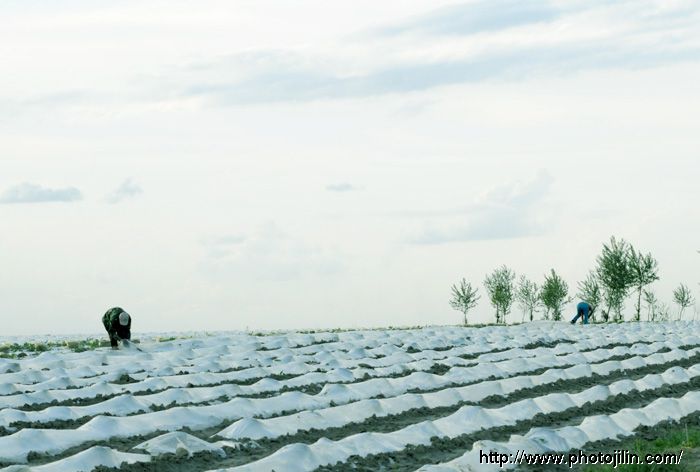 瓜农的地膜内,西瓜秧已经长出三个叶啦!摄于西瓜产地,黑水境内.瓜农正在揭开地膜.