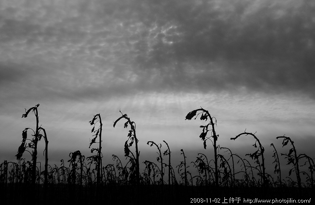太压抑了, 看了这片子,首先被影调所感染。 那些掉了头的葵花杆伫立在昏昏的阴霾之中, 不由产生一种荒凉凄惨的末日之感。 好片。赞。