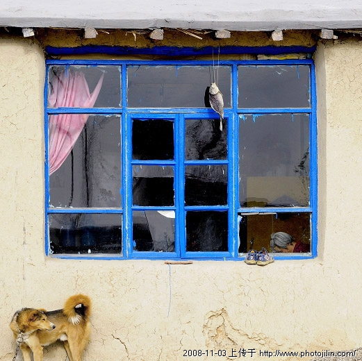 传统印象中的农家,房梁上该是挂着串黄玉米或者是红辣椒,若再有把锄头镰刀点缀着就更好了。窗棂上呢,贴着幅大福字抑或是几点窗花,那份温暖啊质朴啊亲切啊,让我们情不自禁的追思和怀想,以至于一踏进农家就下意识的去找寻。牤子展示给我们的这幅农家,中规中矩,看似平淡无奇,细细品味总觉独具匠心,悠然的垂下的那条鱼,让我们眼前一亮,虽也是农家的普通细节,实则却突破了传统定式,起码让观者摆脱了视觉疲劳,那幅粉色窗帘漫不经心的起着色彩补位和画面平衡的作用,更 体现出 现代农村 的和谐特色,回头张望的 大黄狗、投在玻璃上的斑驳树影,甚至那双蓝胶鞋,在整个画面中都成为不可或缺的元素,特别是那位低着头的做着家务活的白发母亲,让整个作品充满了浓郁的生活气息。亲切的农家!和谐的农家!赞一个!