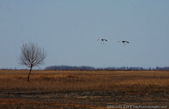 小树与鹤构成呼应,达到画面平衡,两只鹤的位置再高些更好。