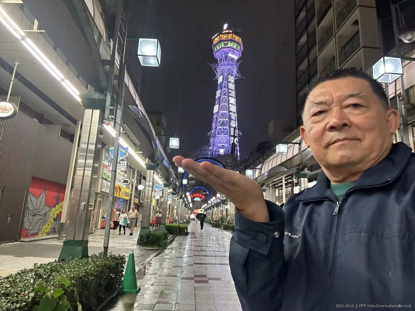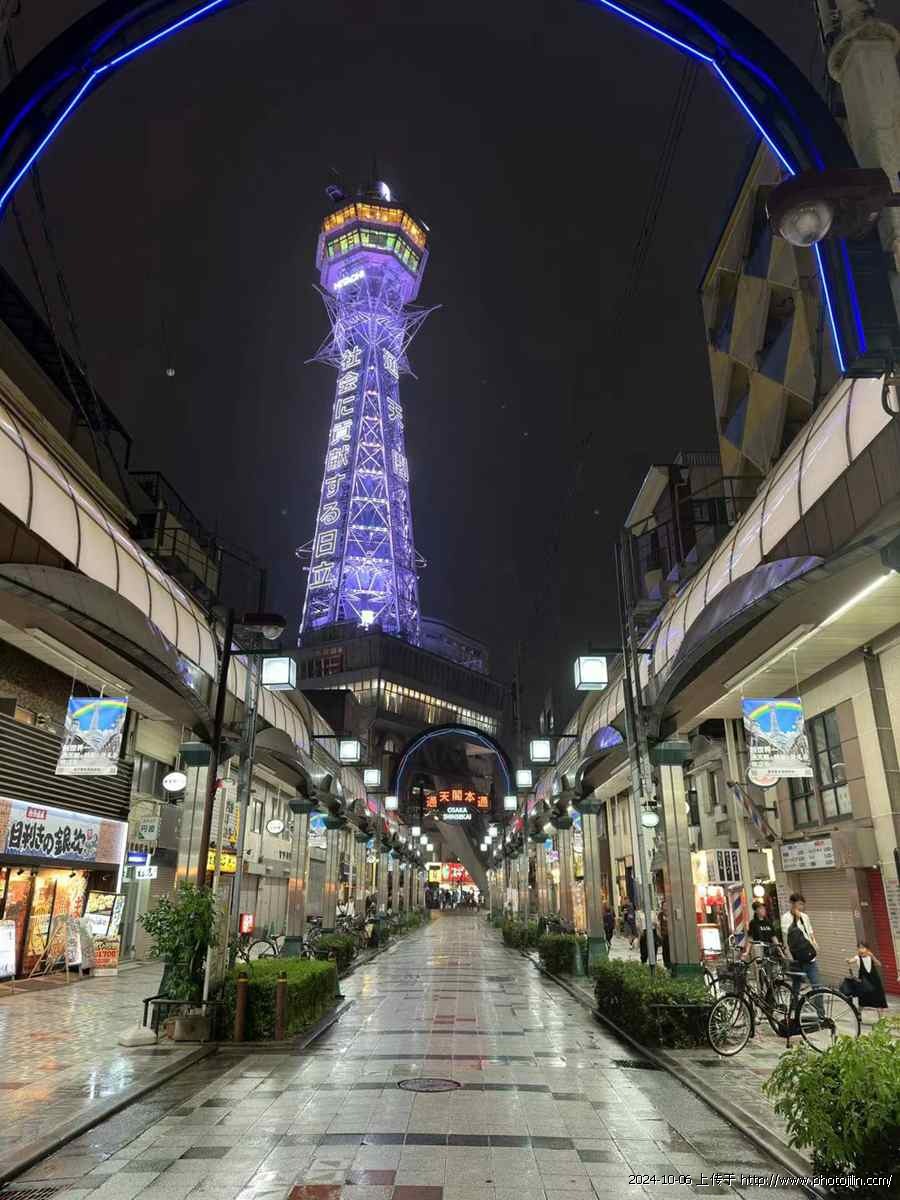 在热闹非凡的新世界商店街,远远便能望见高高的通天阁在夜光中宛如一颗璀璨的明珠,通身散发着蓝色的光芒,吸引着大批游客纷纷驻足观赏、拍照留念。